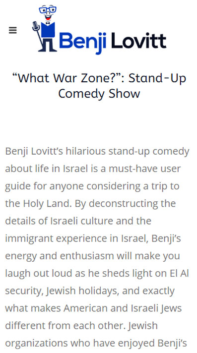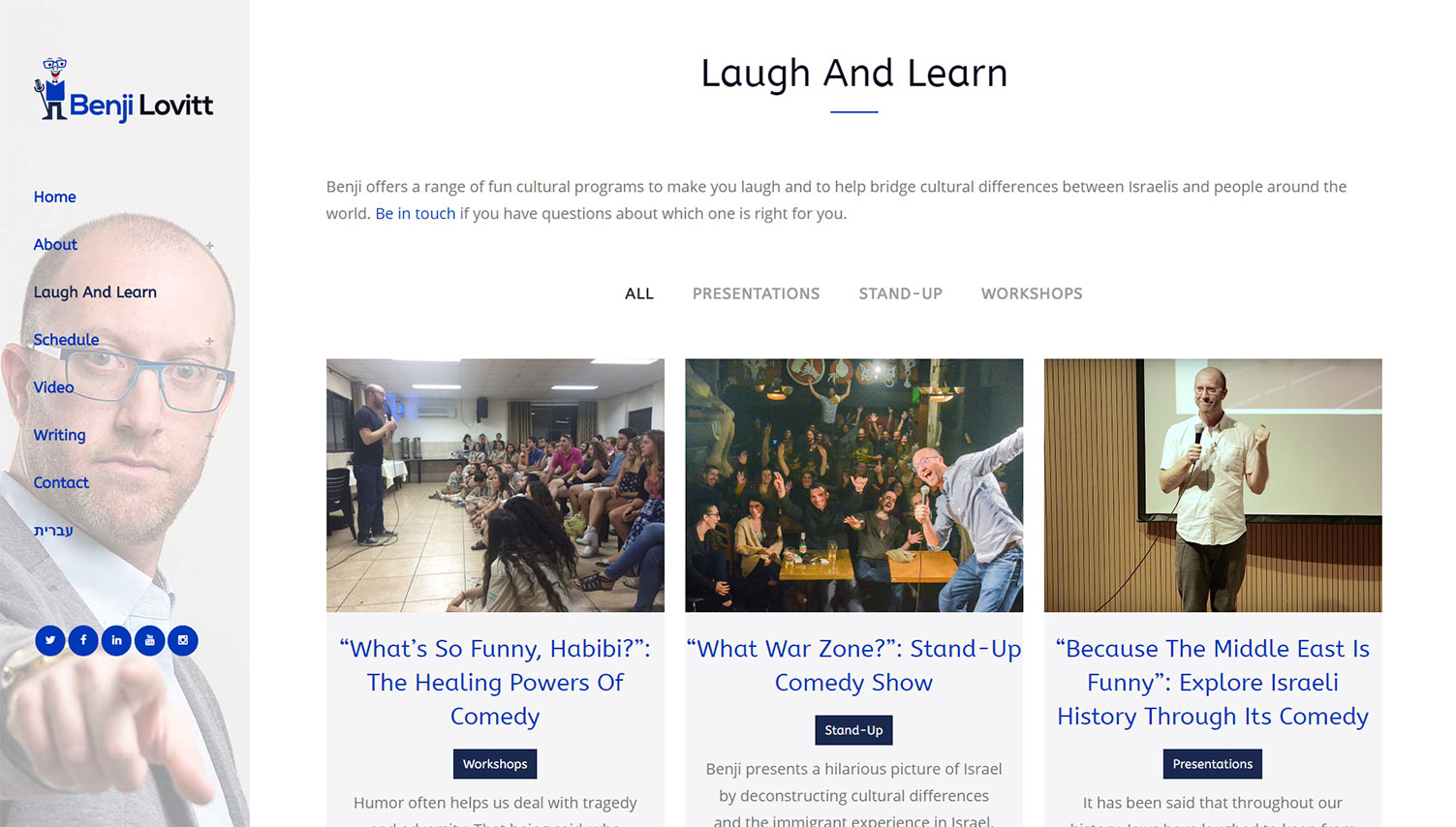 Benji Lovitt, Comedian, Educator & Writer, has been translating the Israel experience through laughter since his aliyah flight landed in 2006. Benji’s observations on Israeli society, combined with his lifelong involvement in Jewish education, create a hilarious narrative that has brought smiles to faces all over the world.