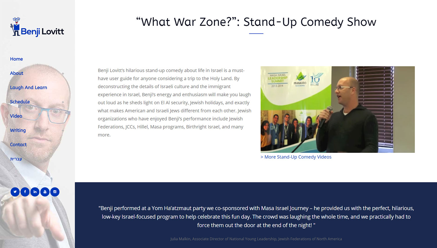 Benji needed a major overhaul on his outdated website to reflect a fresher, more professional look to push his work forward. At the end of the day, he's a comedian and needs to wow people right away. We designed and developed his new website putting his services in the spotlight and moved his blog to the sidelines.